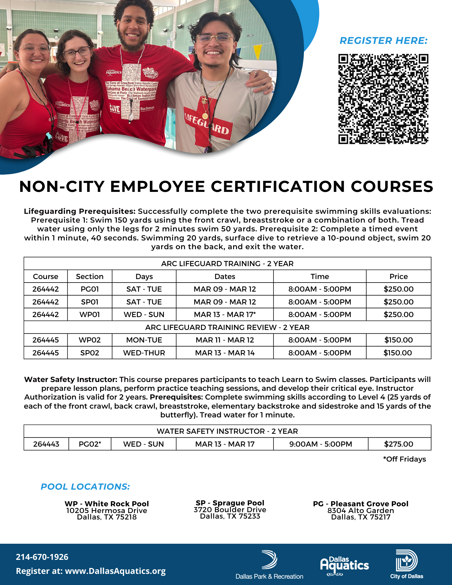 The Dallas Park and Recreation Department’s Aquatic Services Division is proud to offer the American Red Cross training and certification programs. Lifeguard and Water Safety Instructor Certification courses prepare individuals for jobs in a variety of aquatic settings such as country clubs, camps, and municipal swimming pools. We also offer re-certification courses in both life guarding and CPR.